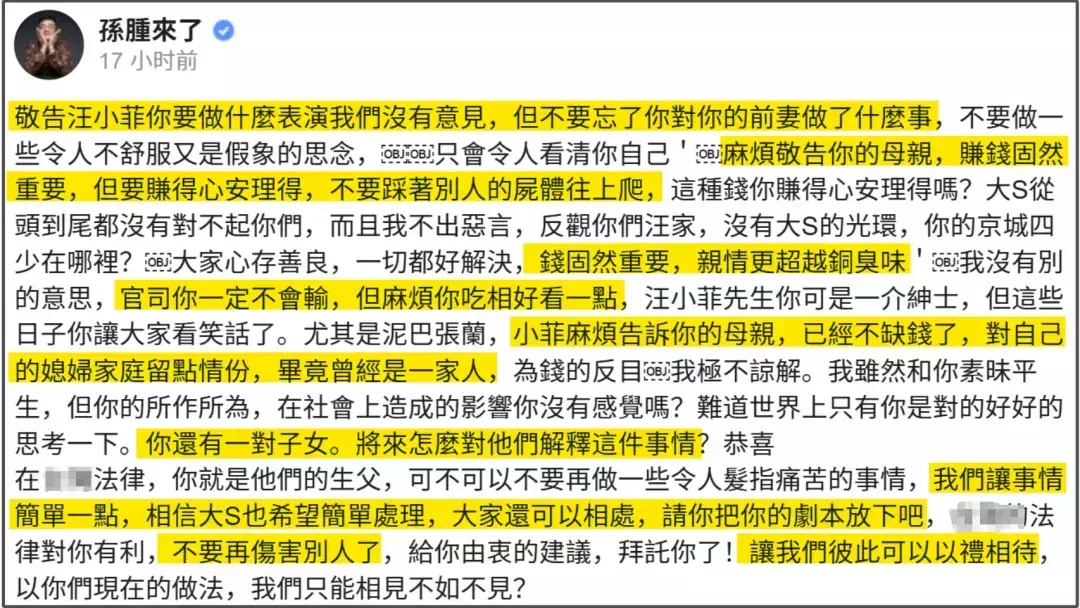 从大S去世后台媒似乎就在不断地带节奏,导致台娱业内的发文似乎已经开始脑补“争产大战”了,一直让汪小菲想想孩子,顾念亲情,放下剧本,以礼相待。还有谁记得汪小菲本人至今没正面回应大S的遗产以及孩子等相关问题吗?