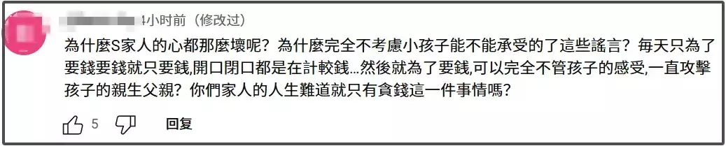 台媒还称S家宣战是想要争取大S子女抚养权。这似乎是又想掌管大S遗产,又不想负担大S房贷,于是向汪小菲讨债。大S生前,S家人享受着大明星赚钱带来的奢侈生活,去世后却不愿意为她收尾。