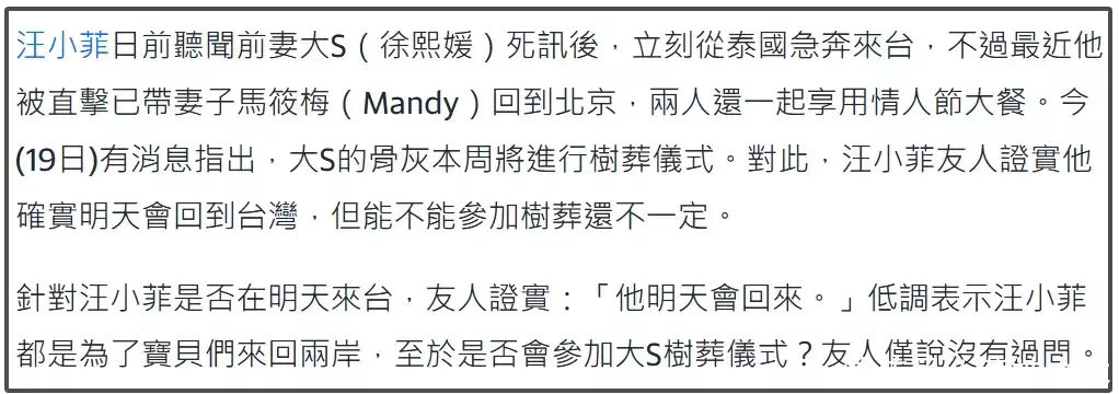 据汪小菲友人爆料,汪小菲不日将会为了孩子再回台湾省,可能是要带孩子回北京,但不知道是否会参加大S葬礼。就想说希望S家和汪小菲都站在亲人的角度为孩子考虑,让孩子尽量安稳长大吧。