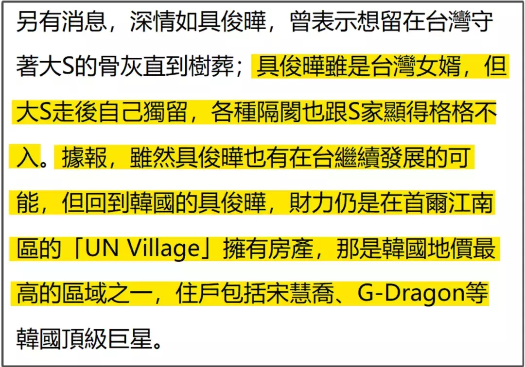 而S家对具俊晔的态度也很微妙,台媒爆料称S家也希望具俊晔回韩国,毕竟人生地不熟,而且当初S妈并不同意大S和具俊晔结婚,还是大S假意签“婚前协议”,把“国家艺术馆”(大S初婚前房产)的房子转到S妈名下才平息。
